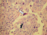Carcinoma indiferenciado tipo células grandes (flecha). H/E