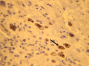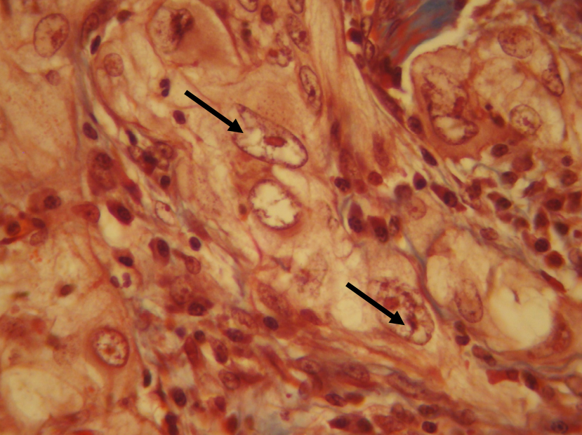 Carcinoma mucoepidermoide de alto grado de malignidad. Células anaplásicas (flecha). Tricrómico de Masson
