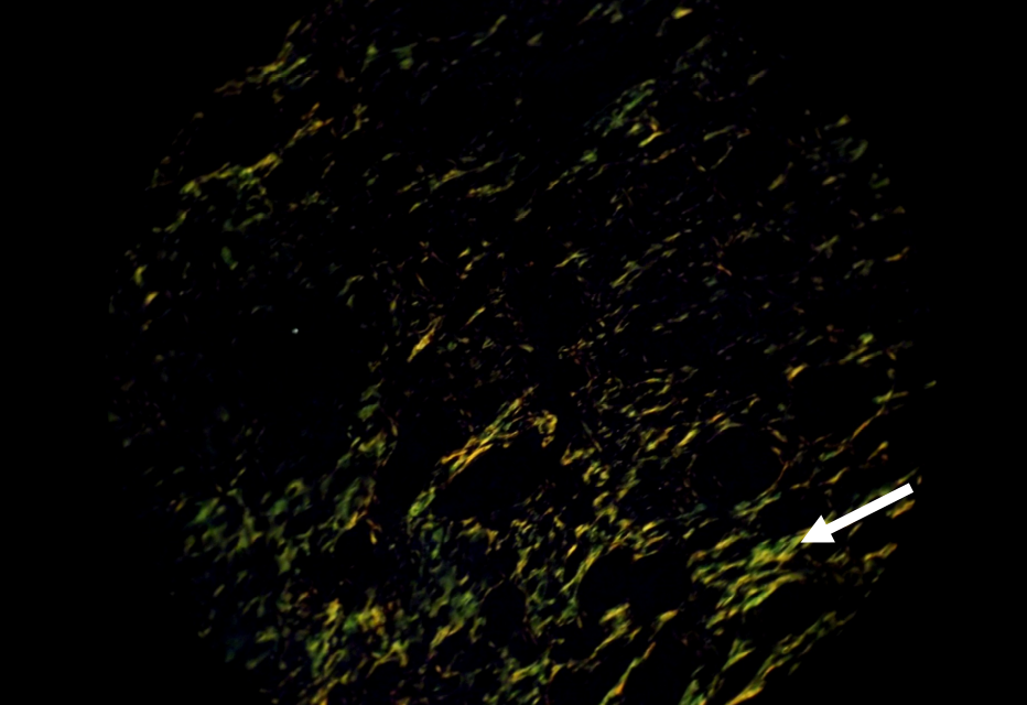 Adenoma pleomórfico. Colágeno Tipo III (flecha). Picrosirius red. Microscopía de polarización.